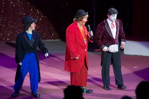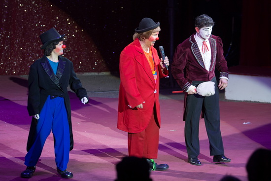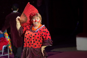 Das Trio Arriola komplettiert mit seinem traditionellen Entree den Reigen der Comedy-Darbietungen. Weißclown David Arriola Mark erreicht Trompete spielend aus dem Gradin die Manege. Im Stil von „abladen-aufladen“ fragen die beiden Auguste nach Arbeit. Schließlich dürfen sie als Tänzer bleiben. In Flamenco-Kostümen legen sie los und dank der „Federung“ unter den Hinterteilen gelingen auch außergewöhnliche Figuren.