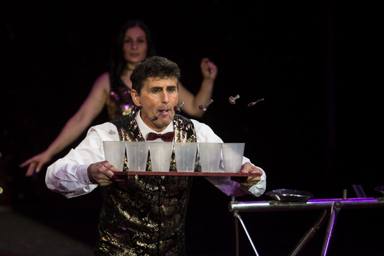 Im zweiten Programmteil sehen wir David Arriola Mark mit einer Teller-Jonglage. In einem flott choreograhierten Ablauf arbeitet er stringent auf das Ziel, acht Teller auf hohen Stäben rotieren zu lassen während er fünf Löffel von einem Tablett in fünf Becher befördert, hin.