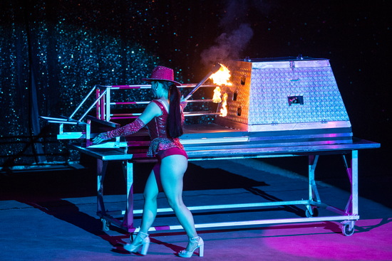 Ein Schalensitzgradin und dekorative rote Logen mit zwei Reihen bequemer Polsterstühle ausgestattet, stehen für die Besucher bereit. Der raumhohe Artisteneingang aus rotem Samt, der mit unzähligen glitzernden Steinchen besetzt ist, komplettiert die Zelteinrichtung.