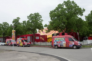 Der umfangreiche Fuhrpark, rot lackiert und in großen gelben Lettern mit dem Circusnamen beschriftet, ist in langen Reihen aufgefahren. Die riesigen Wohnwagenzüge der Familie nehmen eine weitere Seite des Platzes ein.