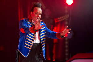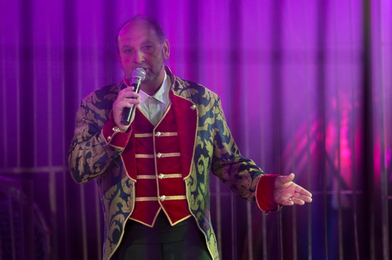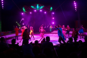 Durch einen hübsch gestalteten kurzen Tunnel führt der Weg über einen roten Teppich ins Chapiteau und der prächtige, raumhohe Artisteneingang nimmt den Blick gefangen. Breite umlaufende Blenden sind in hervorragender Manier als Vorhänge gestaltet und üppig dekoriert. Die zahlreichen Scheinwerfer akzentuieren die Konturen und die Gardine aus schwerem rotem Samt.