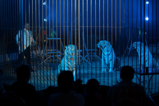 Yannick Cagniac lässt drei weiße Tiger ihr umfangreiches Trickrepertoire ausführen. Souverän agierend, ruft der erfahrene Dompteur Hochsitzer, Rollover, Teppich, Pyramiden, Sprungvarianten und andere Elemente der erstklassigen Darbietung ab.
