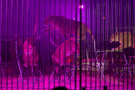 Direkt im Anschluss ist Jessy Cagniac mit fünf Löwinnen zu erleben. In hohem Tempo erfolgen die lebhaften Aktionen. Sprünge führen hinauf bis an den Rand des Zentralkäfigs und über andere Tiere hinweg. Hochsitzer in der Pyramide, am Platz und in der Manegenmitte wechseln mit rasanten Scheinangriffen und Schmuseszenen. Abschließend wird der sich niederwerfende Dompteur von einer Löwin übersprungen.