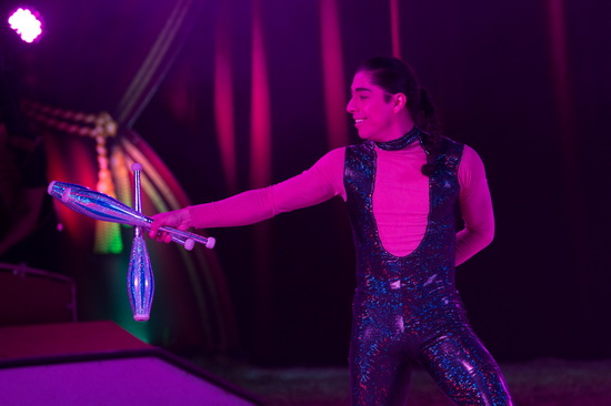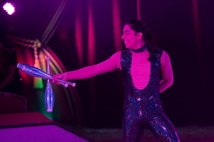 Tempojongleur Jonathan absolviert den ersten Teil seines Auftritts mit Keulen. Versiert arbeitet der junge Mann zahlreiche unterschiedliche Routinen zunächst mit drei und hernach mit vier und fünf Requisiten. Die folgenden Touren werden mit Tennisbällen ausgeführt.