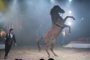 Abschließend präsentiert Jessy Cagniac die neue Freiheitsdressur des Hauses. Vier goldfarbene und zwei schwarze Hengste laufen eine Vielzahl unterschiedlicher Figuren. Pirouetten und Volten, Gegenläufe und andere Figuren werden souverän ausgeführt und fehlerfrei vorgetragenes flechten gehört ebenfalls zum Repertoire. Die stark kontrastierenden Fellfarben bieten zusätzliche interessante Effekte. Zwei Ponys und ein Araberhengst bieten mit einer Reihe unterschiedlicher und exzellent ausgeführter Steiger das höchst gelungene Da Capo dieses equestrischen Highlights.