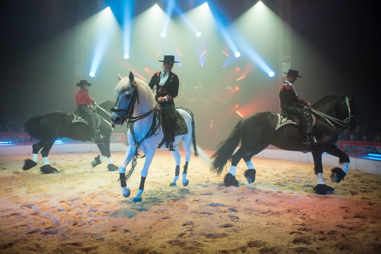 Nach dem eindrucksvoll vom Orchester und Lightshow gestalteten Opening startet die Spielfolge mit einer klassischen Hohen Schule im spanischen Stil.