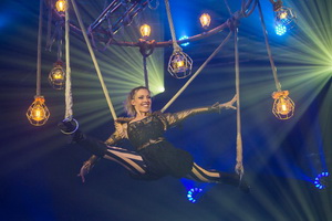 Perle Micheletty kombiniert in ihrer Luftnummer Deckenlauf und Schwungseil. Ein waagerecht hängender großer Metallring trägt sowohl das Schwungseil, als auch, rechtwinklig zu dessen Achse angeordnet, einen Träger mit Seilschlaufen. Optisch aufgewertet wird das Requisit durch zahlreiche nostalgisch inspirierte Leuchten. Gekonnt präsentiert die sympathische Artistin ihre umfangreiche Trickfolge.