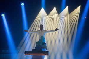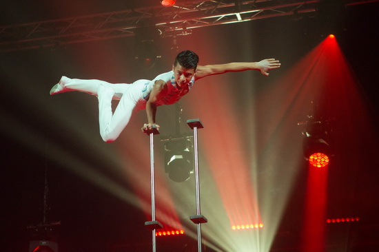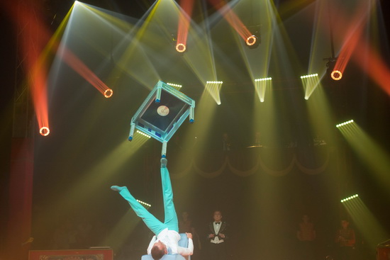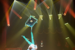 Ein wahrer Stern am Circushimmel, Enzo Caplot - dreizehnjähriger Sohn von Steeve Caplot - begeistert mit einer Handstandequilibristik der Extraklasse. Der Teenager verfügt Kraft, enorme Körperbeherrschung und Ausstrahlung. Nach den ersten Handstandfiguren auf einem hohen chromblitzenden Piedestal baut er gekonnt Klötzchentürme auf. Perfekt gearbeitete Einarmer erfolgen im Anschluss. Ein erstklassiger Kopfstandauf der Mittelsäule des Piedestals wird sehr lange gehalten, während diese hoch in Richtung Kuppel ausfährt und sich hernach wieder absenkt. Doch diese Spitzenleistung war bei Weitem noch nicht der Abschluss seiner Evolutionen. Auf der immer wieder hochfahrenden Säule, die durch Handstäbe noch weiter verlängert wird, folgen in großer Höhe Handstand, Einarmer und Handstandwaage in Perfektion, wobei auch beim umsetzen von einer in eine andere Position keine Unsicherheiten zu erkennen sind. Chapeau.