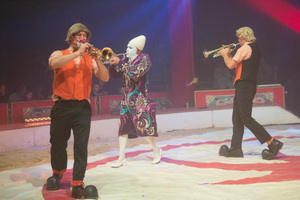 Das Clowns-Trio „Caplotletti“ ist mit seinem umfassenden Entrée vor der Pause zu erleben. Mit Hingabe und eigenem großen Spaß am Spiel – wir hatten Gelegenheit die Herren nachmittags bei der Probe zu beobachten – gehen die Brüder Steeve und John Caplot zusammen mit Weißclown Cappuccino zu Werke. Höchst unterhaltsam reihen sich die Gags aneinander derweil die zahlreichen Kinder im Publikum vor Begeisterunge kreischen und lebhaften Anteil am Manegengeschehen nehmen. Immer wieder erlebt das turbulente Spiel eine neue Wendung, nimmt die Handlung einen anderen Verlauf und auch wir, die wir die fremde Sprache nur zum Teil verstehen, haben unseren Spaß. Nach mehr als fünfunddreißig Minuten endet das muntere Treiben wie es begann – mit hervorragendem Trompetenspiel der drei Akteure. Welches Entrée gespielt wurde? Eine kreative Komposition aus „Messerbrett“, „Kunstschütze“ und „musizieren verboten“.