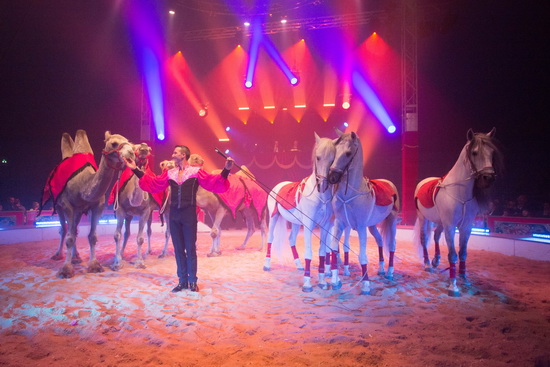 John Caplot präsentiert eine neu einstudierte Dressurschöpfung. Vier Steppenkamele und vier prachtvolle Schimmelhengste interagieren in einem temperamentvollen Ablauf. Vielseitige Figuren lässt der versierte Dresseur souverän und gekonnt ausführen. Harmonisch fügen sich Volten, Gegenläufe und viele weitere Elemente zu einer gelungenen Komposition. Exzellente Steiger runden den Auftritt ideal ab.