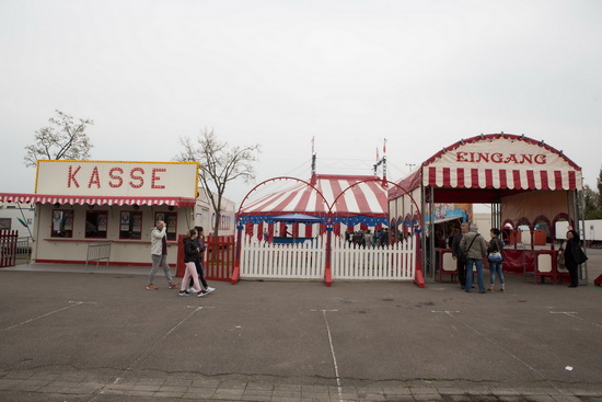 Wie von einer echten Circusfamilie nicht anderst zu erwarten, ist es der Familie Spindler auch in diesem Jahr wiederum gelungen den zahlreichen Besuchern ihr Unternehmen und ihre Manegenperformance in bestem Licht zu präsentieren. Das rot-weiß gestreifte Chapiteau, der in den Hausfarben cremeweiß-rot gehaltene traditionelle Stakettzaun, die romantischen Lichterbögen und viele weitere traditionelle circensische Details lassen den Circus in der untergehenden Abendsonne hervorragend dastehen. Die mit einer hell strahlenden Leuchtschrift versehene Circuskassa rundet das Arrangement ab. Der mächtige Sattelauflieger, dessen Vorderseite im Angedenken an die große Circusdirektorin und Persönlichkeit Rolina Spindler-Barelli gestaltet ist, lenkt die Blicke der Besucher auf sich. Der Fuhrpark des Unternehmens zeigt sich in einer eleganten cremeweißen Lackierung mit kräftigen roten Details. Moderne Scania und Volvo Zugmaschinen stehen für das schnelle umsetzen des Circus zur Verfügung. Die Wohnwagen der Artisten und Mitarbeiter nehmen eine Platzseite ein und im hinteren Bereich des Geländes sind großzügige Ställe und Paddocks für Pferde und Kamele platziert.