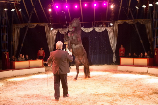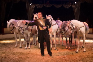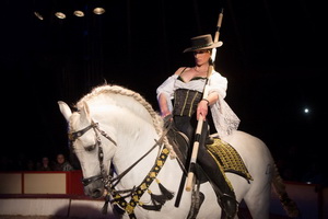 Der prachtvolle Andalusierhengst „Zorro“ wird von John Henry Spindler zu seinen Lektionen angeleitet und es ist immer wieder eine Augenweide, diesen erfahrenen und großartigen Circusmann mit seinen Präsentationen in der Manege erleben zu dürfen. Hervorragende Steiger, Spanischer Tritt entlang der Piste und das tiefe durchstecken des Kopfes zwischen den Vorderhufen sind die Paradeübungen, die der temperamentvolle Hengst bravourös ausführt.