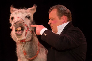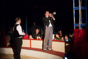 Zunächst jongliert er mit drei Schirmen, die nach „misslungener“ Routine per Fußkick in einer Kiepe auf seinem Rücken landen. Er widersetzt sich als Zuschauer, der mit seinem Gebaren den Ablauf stört, dem Manegensprecher als dieser seine Eintrittskarte kontrollieren möchte. Grauesel „Manolito“, ein störrischer Vertreter seiner Rasse, lässt sich schließlich dazu herab, im Spanischen Tritt zu gehen, einen Teppich auf zu rollen und aus einer Flasche zu trinken. Den mahnend erhobenen Zeigefingers des Clowns quittiert er mit einem anheben der Oberlippe und der abschließende Steiger landet auf den Schultern des Vorführers.