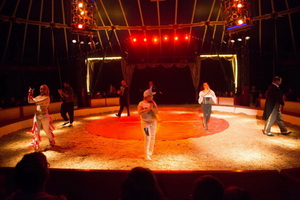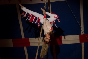 Hoch unter der Kuppel des Chapiteau erleben wir zwei hervoragend präsentierte Luftnummern. Zunächst ist es an Miss Sydney mit ihrem romantisch gestalteten Auftritt an den Tuchstrapaten die Zuschauer zu verzaubern. Kraftvoll ausgeführte Tricks und risikoreiche Abfaller reihen sich harmonisch aneinander. Mit einem Schuss sinnlicher Erotik erfüllt die sympathische Artistin den Traum vom fliegen.