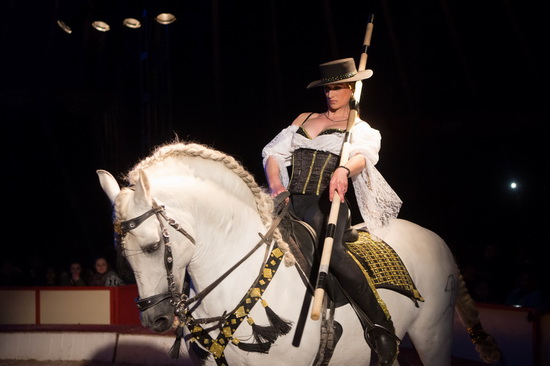 Salima Folco reitet auf dem andalusischen Schimmelhengst „Armarando“ eine vollendete Hohe Schule. Temperamentvoll präsentieren Reiterin und Ross zu mitreißenden Melodien ihr umfangreiches Repertoire im spanischen Stil. Den ersten Teil der Darbietung gestaltet die Amazone in Art der Vaqueros. Um eine lange Stange, deren Spitze unterschiedliche Muster in den Manegensand zeichnet werden immer wieder neue Figuren geritten. Die anschließenden Traversalen und Piaffen erfolgen in erstklassiger Ausführung.