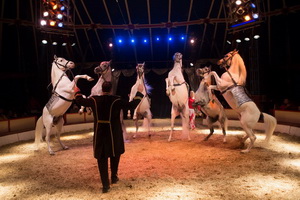 Höhepunkt der Tierdarbietungen ist die hervorragende Freiheitsdressur sechs feuriger weißer Araberhengste. Francesco Spindler präsentiert die edlen Pferde elegant in seinem unverwechselbaren Stil und lässt die komplexen Abläufe in flotter Gangart und Perfektion ausführen. Mit großer Souveränität führt der erfahrene Tierlehrer die Chambrière. Höchst eindrucksvoll präsentieren sich die unterschiedlichen, variantenreichen Steiger und mit einem parallelen Vorwärtssteiger zweier Hengste durch die gesamte Bahn erreicht die Darbietung ihren spektakulären Höhepunkt.