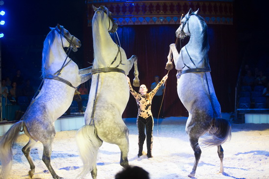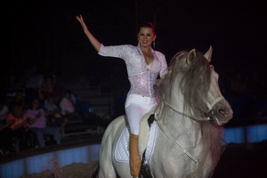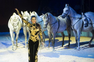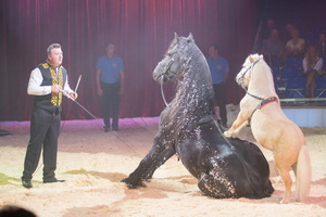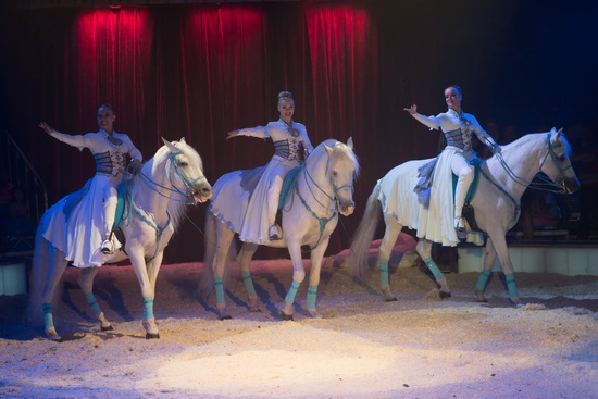 Einen letzten, erlesen inszenierten Auftritt mit Tieren bildet die Hohe Schule, geritten von Natascha Wille-Busch und den Damen Saabel. Auf einem prächtigen Andalusier absolviert die charmante Juniorchefin ein breites Repertoire eindrucksvoll vorgetragener Lektionen. Gekonnt ausgeführte Levaden markieren den Höhepunkt ihres Parts. Die Damen Saabel führen ihre harmonischen Reitfiguren auf Luistanos und Friesen aus. Ein dreiköpfiges Ballett gibt diesem klassischen Circus-Act einen romantischen Drive und vereint das equestriche Können der einzelnen Sequenzen harmonisch zu einem wunderbaren Schaubild, das mit der musikalischen Begleitung und Beleuchtung eine bezaubernde Symbiose eingeht.