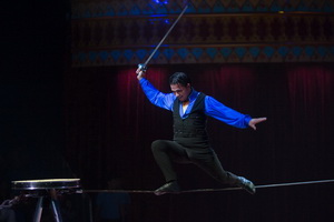 Seiltänzer Eric Niemen wurde mit seiner Darbietung aus dem letztjährigen Programm prolongiert. Schwebend leichte Schrittfolgen prägen sein Scheingefecht mit einem Säbel, der nach weitem Schwung stilvoll übersprungen wird. Viele weitere Sprünge - u.a. durch einen selbst gehaltenen Reifen, über eine hohe Hürde inclusive perfekten Scheinsturzes - erfolgen gekonnt. Ein equisit ausgeführter Rückwärtssalto bildet den strukturellen Höhepunkt der Nummer.