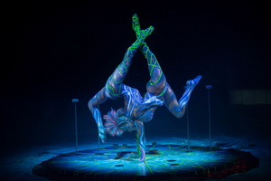Alexandra und Kelly Saabel bieten mit ihrer erotisch kraftvollen Handstandequilibristik den artistischen Höhepunkt vor der Pause. Synchron erfolgen die anspruchsvollen Tricks die auf den Handstäben eleoquent präsentiert werden. Im Schwarzlicht bewegen sich die Artistinnen anmutig in den phantastischen, von Alexandra Saabel kreiierten Kostümen.