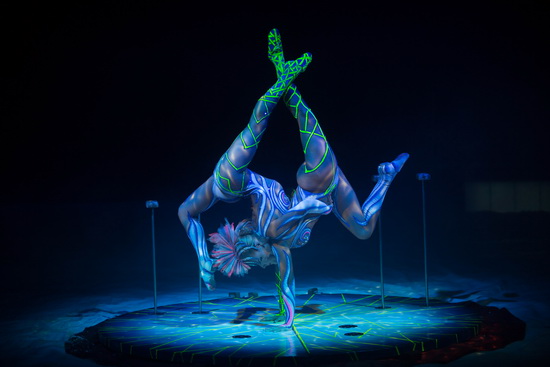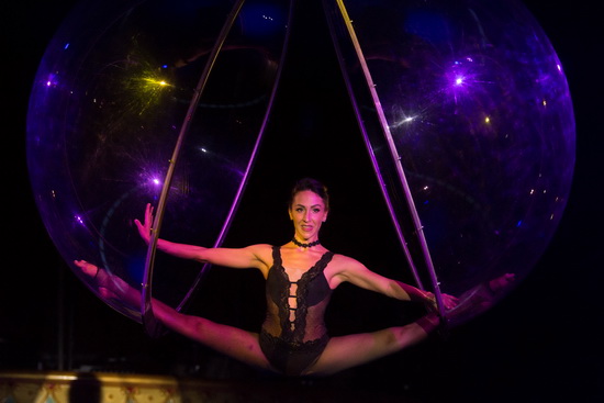 Eine im Scheinwerferlicht glitzernde Plexiglaskugel, hoch unter der Kuppel des Zeltpalastes, füllt den Luftraum und bietet Sharon Monni die Bühne für ihre sinnliche Kontorsin hoch über den Köpfen des fasziniert aufschauenden Publikums. Die beiden Schalen der Kugel sind lediglich oben an der Aufhängung mit einander verbunden und öffnen sich durch die Aktionen der Artistin, die somit auch für den nötigen Nervenkitzel bei den Zuschauern sorgt. Ein Höhepunkt im wahrsten Sinne des Wortes.