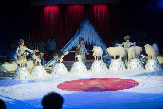 Der zweite Teil des Programms beginnt mit der temperamentvollen Polarhunde-Show der Familie Saabel. Rasant umrundet ein Schlittengespann, gezogen von je vier Huskies und Samojeden-Spitze, die Manege. Requisiten im Polar-Look und wunderschön designte, mit Pelz besetzte Kostüme der Vorführerinnen sorgen für ein höchst stimmiges Ambiente. Routiniert läuft die Darbietung ab und in voller Power prescht der Hundeschlitten schließlich wieder aus dem Sceinwerferlicht.