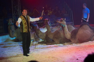 Im weiteren Programmverlauf lässt der vielseitige charmante Tierlehrer sechs junge Dromedare ihr erlerntes Können zeigen. Die Tiere erleben an diesem Abend ihr Manegendebut. In flottem Tempo und fehlerfrei absolvieren die Newcomer ihr Repertoire.
