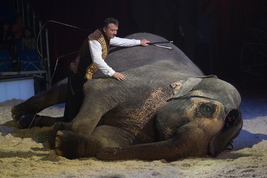 Gleich im Anschluss sind die beiden Dickhäuter des Circus zu erleben. Die asiatische Elefantin „Karla“ und ihre afrikanische Stallgenossin zeigen in einem tiergerechten Ablauf einen abwechslungsreichen Mix aus Laufarbeit und akrobatischen Tricks. Souverän und ruhig lässt Manuel Frank die beiden grauen Riesen agieren.