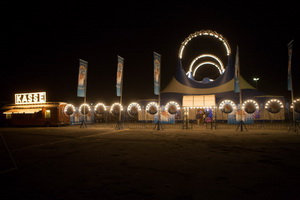 Die Dachplanen des Chapiteau und des zweimastigen Vorzeltes zeigen ein Dekor in waagrechten breiten Streifen in den Hausfarben. Am Rondell sind die Planen weit nach außen gezogen und enden in elegant geschwungenen Bögen. Die langestreckte Kuppel wird von hohen Gittermastbögen überragt und über Allem strahlt der von tausenden Lämpchen gebildete Namenszug.