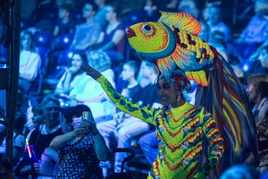 Nach der launigen Begrüßung durch eine Stimme aus dem Off plätschern die ersten Fontänen aus dem Bühnenboden empor und das „Ballett on the Beach“ performt in phantastischen Kostümen rings um ein gläsernes Bassin, auf dessen Rand eine schillernde Nixe – Veronica Faltyny – ruht. Sie zeigt ihre attraktive Trickfolge am Luftring im steten Wechsel mit Aktionen im Bassin. Nun bevölkern „Korallenfische“, „Quallen“ und „Kraken“ Treppen und Gänge derweil „Seepferdchen“ auf Rollern über die Bühne gleiten.