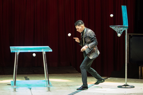 Bounce-Jongleur Sergoi Paolo präsentiert die ersten Muster auf einem gläsernen Piedestal. Die weiteren Routinen erfolgen zu ebener Erde und wobei auch der Zwischenraum der beiden Tischplatten genutzt wird und schließlich die Bälle von dort den Weg in einen kleinen Basketballkorb finden. Als Highlight springt der aus Chile stammende coole junge Mann mit der machohaften Attitüde einen Salto während sein Muster mit fünf Bällen weiterläuft.
