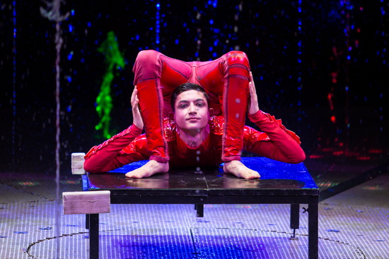 Die Kontorsion-Darbietung von Lorenzo Bernardi wird mit einer umfangreichen Ballett-Szene zu Beginn und verschiedenen Mustern an Fontänen effektvoll in Szene gesetzt. Nachdem er sich in einen gläsernen Kubus gezwängt hatte, bringt er Körper und Extremitäten in zahlreiche extreme Positionen. Der Stand auf einem Mundstab in Verbindung mit einem Schuß mittels Pfeil und Bogen auf einen Luftballon markiert den Höhepunkt seiner Evolutionen.