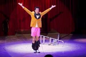 Viele Jahre prägte Cesar Dias mit seiner Komik die Programme des Zirkus Charles Knie, nun hat der gleichfalls aus Portugal stammende Michael Cadima seine Nachfolge angetreten. In einem quitschbunten Anzug, mit Fliege und Shorts, erobert er mit einem imaginären Hund, dieser trägt eine Halskrause, die Bühne. Bald entledigt er sich des „Tieres“ und nimmt sodann an einem imaginären Schlagzeug Platz. Zu den vom Band eingespielten Beats mimt er den coolen Drummer. In einem zweiten Auftritt geht es, mit einem Mitspieler aus dem Publikum sportlich zu. Man wetteifert in den Disziplinen imaginäres Seil springen und imaginärer Baskettball. Schließlich sehen wir den Komiker als Sänger, der allen Widrigkeiten trotzt und seinen Auftritt durchzieht. „I'm still standing“ ist der Song zu dem er performt und dabei den Tücken des Mikrofons, mehrfach seiner herab rutschenden Hose und endlich einer widersetzlichen Stufenleiter ausgesetzt ist.