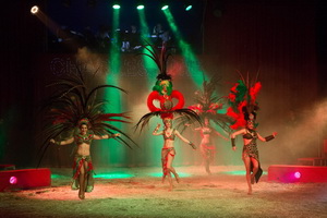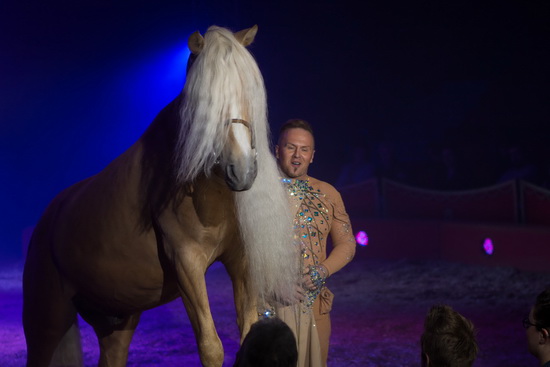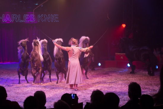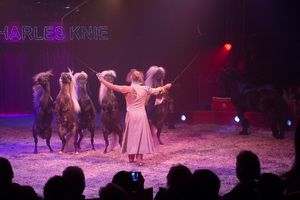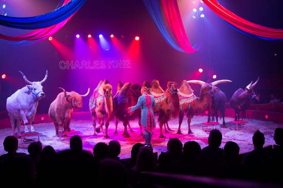 Tierlehrer Marek Jan Jama erleben wir insgesamt drei Mal mit seinen Dressurdarbietungen im Verlauf des Abends. Der große artenreiche Exotenzug des Zirkus Charles Knie wird weiterhin höchst effektvoll von einem großen blau-roten Baldachin in der Kuppel umrahmt. Der Ablauf der Nummer wurde gegenüber dem Vorjahr variiert. Zunächst ziehen vier Kamele ihre Bahn und bald kommen vier braune Araberhengste hinzu. Variantenreiche Lauffiguren lässt der versierte Tierlehrer souverän ablaufen. Mit vier Zebras vergrößert sich die Gruppe alsdann auf zwölf Tiere in der Manege. Vier Rinder verschiedener Rassen nehmen bald darauf den Platz der Pferde und Zebras ein und um die in der Manegenmitte verharrenden Vierbeiner laufen zwei Emus ein paar Runden. Zum Abschluss der Darbietung präsentieren sechs Lamas ihr Können und mit effektvollen hohen Barrieresprüngen findet der Auftritt seinen Abschluss.
