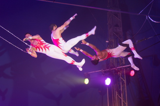Ein Programm-Highlight, heutzutage leider viel zu selten zu sehen, bieten die Flying Costa direkt vor der Pause am Flugtrapez. Zwei Flieger und eine Fliegerin beherrschen eine Vielzahl sehr elegant ausgeführter Sprünge. Ein perfekt im ersten Versuch gelungener dreifacher Salto bildet den Höhepunkt der Evolutionen, die mit einer erstklassigen Passage und einem „Kopfsprung“ hoch aus der Kuppel ihren idealen Abschluss findet. Einen Teil der Nummer begleitet Ives Nicol mit seinem Live-Gesang und nachdem die Artisten wieder in der Manege stehen umrahmt das Ballett zu temperamentvollen Sambaklängen die Szene.