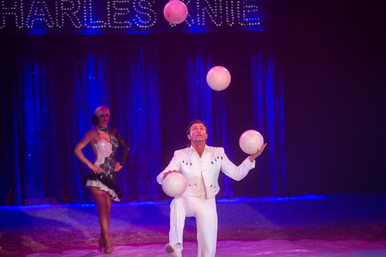 Ives und Ambra Nicols gehören auch in dieser Saison unverändert zum Ensemble des Zirkus Charles Knie. Auf Grund einer Rückenverletzung von Ambra musste die vorzügliche Darbietung an den Tuchstrapaten leider einige Tage pausieren und wir erleben das Duo nur mit dem Jongleur-Auftritt. Ives zeigt sein umfangreiches Können mit Bällen, Bumerangs, Keulen, und Sombreros routiniert und mit großer Sicherheit. Charmant interagiert er mit dem Publikum und die variantenreichen Fußkicks der Keulen kommen bei den Zuschauern in besonderer Weise an.