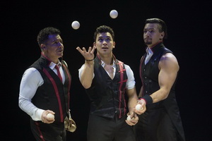 Tempo ist angesagt, wenn die Messoudis zur Gruppenjonglage bitten. Die ersten Touren führt das Trios mit Tennisbällen aus, ehe das Gros der verschiedenen Muster mit silbernen Keulen erfolgt. In ständig variierenden Formationen erfolgen die elegant ausgeführten Passings. Kollektives staunen ist angesagt, wenn zum effektvollen Abschluss der Darbietung gezielte Würfe die Zigarette aus dem Mund, den Hut vom Kopf und die Sonnenbrille von der Nase von Vater Messoudi fegen.