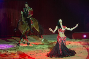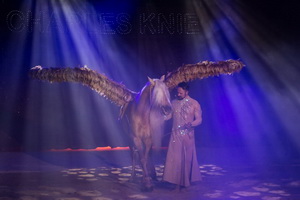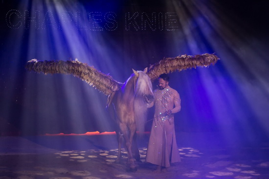 Zu Beginn des zweiten Programmteils reitet Marek Jama auf einem goldschimmernden Hengst eine Hohe Schule. Auch dieser Auftritt des versierten Tierlehrers wird mittels des Balletts effektvoll inszeniert.
