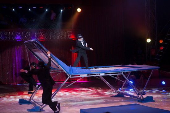 Wenig später erleben wir die „Wulber Brothers“ mit einem mitreißenden Auftritt auf dem Trampolin. Im Blues Brothers Stil präsentieren sie mit Unterstützung der drei Damen eine große Show und feine Akrobatik auf dem elastischen Tuch.
