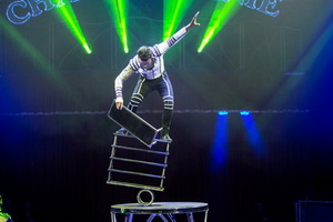 Spannung und Nervenkitzel verbreitet Maverik Niemen auf der Rola-Rola. In großer Höhe stellt er ein ums andere Mal sein Balancevermögen auf dem labilen Untergrund unter Beweis. Seil springen, Handstand und Balance auf einem großen Ball werden mit großer Sicherheit gezeigt, dann stapeln sich Bänkchen unter seinen Füßen. Abschließend „ruht“ das Rollbrett auf sechs Zwischenelementen und zwei Rollen.
