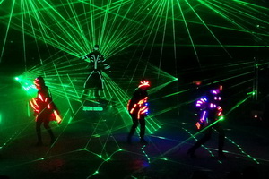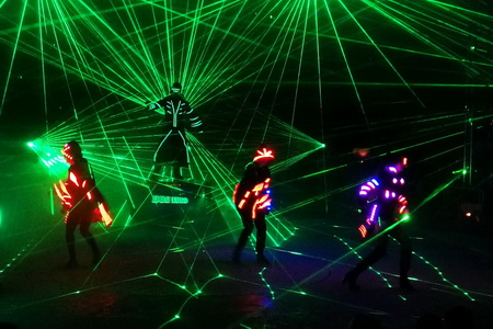 Die Laser Show des Duo Lugo wartet mit einer Reihe besonderer Effekte auf. Die bunten Lichtstrahlen entstehen nicht nur auf der Bühne, sondern schießen auch von etlichen anderen Positionen durch den Raum. Eine fliegende Gestalt mit einem per unzähliger LED bunt illuminiertem Umhang und aus der Bühne aufsteigende Feuersäulen sind weitere Elemente, die erstaunte Ausrufe hervor rufen.