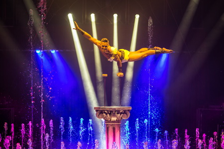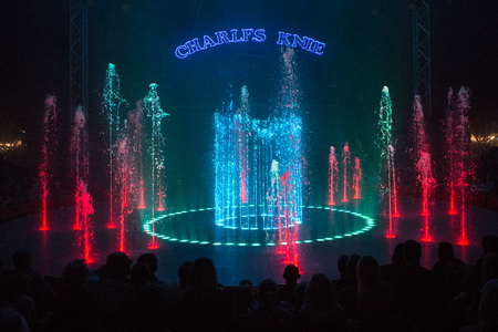 Mit dem neu entwickelten Konzept seiner als „Wasserspektakel“ bezeichneten Show geht der Zirkus Charles Knie eigene Wege, die mit dem bekannten „Circus unter Wasser“ nur das namensgebende Element gemeinsam haben. Wird dort ein Programm auf einer kleinen Insel über einer ansonsten wenig genutzten Wasserfläche geboten, ist bei Charles Knie das nasse Element ausschließlich in Form vielseitigster Fontänen, die aus mehreren hundert Düsen aus dem Boden der Bühne hervorschießen, zu erleben. So kommt zu einem opulenten und exzellenten Lichtdesign, wie man es in einem reisenden Unternehmen nicht besser bieten kann, in Verbindung mit hervorragender musikalischer Begleitung das Wasser als weiteres gestalterisches Element hinzu, mit dem die Artisten in einmaliger Weise unterstützt und in Szene gesetzt werden. Wasser, als eines der unverzichtbaren Elemente jeden Lebens, berührt die Sinne aller und übt von je her eine Faszination aus, der man sich nur schwer entziehen kann. Die perfekte Integration in die Show lässt die einzelnen Darbietungen in einmaliger Weise zur Geltung kommen.