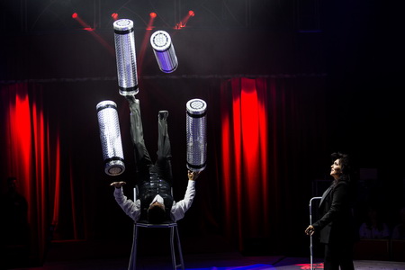 Mit der Antipoden Darbietung von Jan Navratil nimmt die Show noch einmal mächtig Fahrt auf. In höchstem Tempo lässt der sympathische Artist bis zu vier Walzen variantenreich auf seinen Händen und Füßen rotieren. Die folgende Tafel wird gleichfalls sicher manipuliert. Den Höhepunkt des Auftritts bildet die Balance eines etliche Meter hohen leiterartigen Gestells, mittels dessen ein Ball über mehrere Etagen in einen Korb an der Spitze gekickt wird.