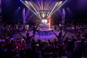 Das große Finale bietet noch einmal alles auf, was diese großartige Show ausmacht. Die Bühne fährt zu einer Pyramide mit mehreren Etagen aus und in der riesigen Spiegelkugel an der Spitze der Wasserkaskaden brechen sich funkelnd die Strahlen der Scheinwerfer zu unzähligen Irrlichtern, die sich überall im Raum widerspiegeln. Diese grandiose Atmosphäre, eine Mischung von „Las Vegas Style“ und „Lido de Paris“, erfüllen Sängerin, Ballett – mit prachtvollem Federschmuck an den Kostümen – und das Ensemble der Artisten mit Leben. Das völlig enthusiastische Publikum feiert die Show, ihre Akteure und vielleicht auch ein wenig sich selbst mit minutenlangen Standing Ovations und „Zugabe“ Rufen. Nur allmählich legt sich der Jubel und wird das Ende der Show realisiert.