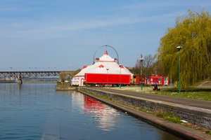 In Visé, einer Kleinstadt direkt an der Grenze zu den Niederlanden, unweit von Lüttich, war der Circus direkt am Ufer der Maas aufgebaut. Das langgestreckte Wiesengelände auf der Kaimauer, hier gastierte 1970 der Cirque Bouglione mit einem Acht-Masten-Chapiteau, bot dem Circus genügend Fläche. Im strahlenden Sonnenschein glänzt das weiße-rote Chapiteau mit seiner hohen Kuppel und das helle grün der frisch sprießenden Vegetation bietet einen erfrischenden Kontrast. Der Fassadenwagen trägt, genau wie einige anderre Fahrzeuge auch, noch die alte Firmierung und ist rings um den integrierten Kassenschalter mit Plakaten dekoriert. Die leuchtend roten Materialtransporter sind rings um das Zelt abgestellt. Die Wohnwagen und Campings reihen sich entlang der den Platz begrenzenden Straße aneinander. Die Freigehege von Pferden, Lamas,