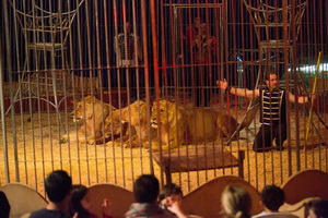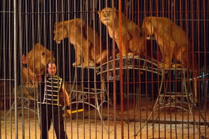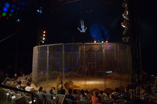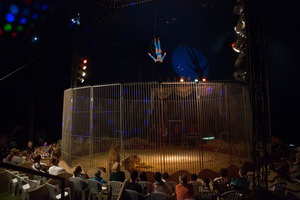 Spektakulär verkauft wird die Ringtrapez-Darbietung von Miss Bettina über dem Raubtierkäfig. Völlig ungesichert arbeitet die versierte Artistin hoch in der Kuppel ihre zahlreichen Tricks. Kraftvoll und elegant erfolgen die Abläufe und ein gekonnter Zehenhang über den Häuptern der Löwen beschließt den gelungenen Auftritt.