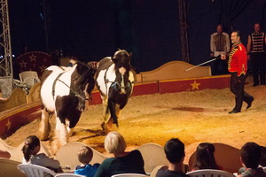 Direktor Simon Dubois ist es auch, der die Cavallerie des Hauses, zwei temperamentvolle irische Tinker, zu ihren Figuren anleitet. Souverän lässt er die Figuren ablaufen und mit einem Kompliment auf den Tonneaus findet die Dressur ihren gelungenen Abschluß.