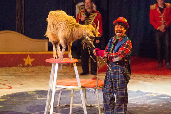 Zwei Mal erleben wir den Mexikaner José Rodogell, alias Clown Cerillo in der Manege. Im ersten Teil mangelt es ihm zunächst am nötigen Applaus, nachdem er angesagt wurde. So muss denn der Auftritt unter der Regie des Chefs einige Male, sehr zur Freude der laut kreischende Kinder, wiederholt werden. Dann endlich werden seine Ansprüche erfüllt und seine Manegenpartnerin „Brigitte“ kann in Erscheinung treten. „Brigitte“ ist eine große hübsche braune Ziege, die willig ihr Können zeigt. Sie besteigt einen hohen Piedestal und steigt auf einem Turm immer kleiner werdender Plattformen empor.