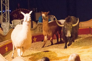 Unter der Peitschenführung von Harry Dubois erobern je ein Lama, Alpaka und Yak die Manege. Neugierig die Logen beäugend drehen sie ihre Runden.