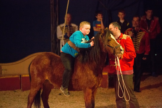 Für großen Trubel auf den Rängen sorgt das abschließende Amateurreiten. Schnell finden sich vier Kinder von etwa zwölf – dreizehn Jahren, die sich wagemutig auf das ungesattelte Pony schwingen. Nach wenigen Galoppsprüngen des Pferdes verlieren sie den Halt und schweben an der Longe durch den Raum.