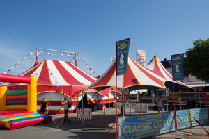 Ein rot-weißes Zwei-Masten Chapiteau, mit goldenen Zierstreifen, moderner Formgebung bildet die Spielstätte. Ein optisch passendes Zeltdach spendet Schatten vor dem Chapiteau-Eingang. Eine Hüpfburg und der Verkaufswagen der Circusrestauration, an dem erwachsene Besucher auch ihre Tickets – für Kinder ist der Eintritt frei – erhalten, sind vor dem Zelt platziert.